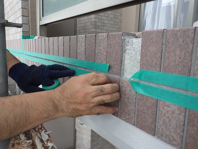 この写真はシーリング工事の養生作業をしている写真です。