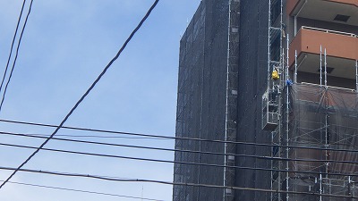 先日、高層マンションにて足場資材の荷揚をリフトで行っていました。