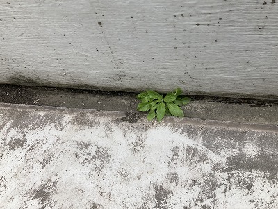 写真1、2 側溝廻りが著しく劣化しており、植物が生えている状況。