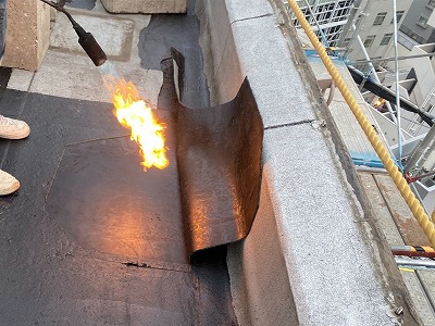 この写真は屋上のアスファルト防水工事の炙り戻し作業の写真です。