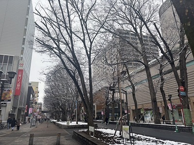 足元のタイルや植え込みにも雪が残り、行き交う人たちもどこか足早でした。
